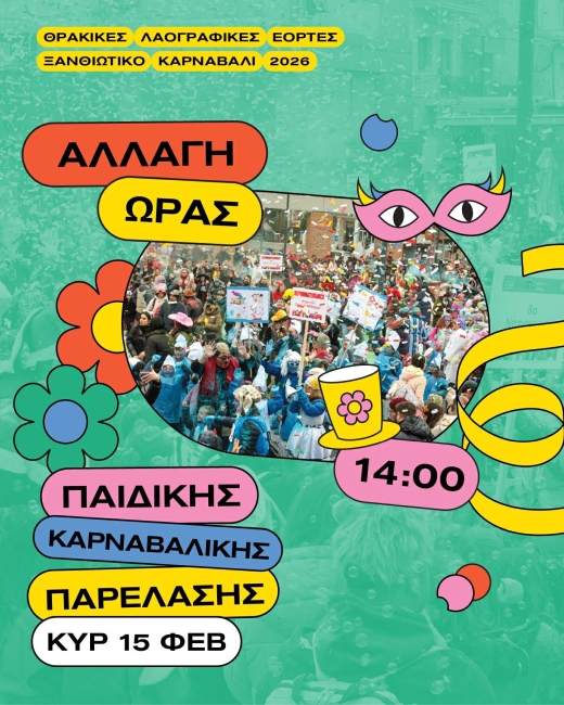 Ο Δήμος Ξάνθης ενημερώνει ότι, λόγω των καιρικών προγνώσεων και σε συνεννόηση με την Ένωση Γονέων και Κηδεμόνων, η Παιδική Καρναβαλική Παρέλαση της Κυριακής 15 Φεβρουαρίου θα ξεκινήσει στις 14:00. Η πομπή των μικρών καρναβαλιστών θα ξεκινήσει από τη διασταύρωση των οδών 28ης Οκτωβρίου και Παπαφλέσσα και θα διασχίσει το κέντρο της πόλης με κατάληξη την Πλατεία Δημοκρατίας, όπου η γιορτή θα κορυφωθεί. Σας περιμένουμε όλους να γεμίσουμε τους δρόμους της Ξάνθης με χρώμα και χαμόγελα, ενώ για τυχόν περαιτέρω αλλαγές θα υπάρξει άμεση ενημέρωση από τα επίσημα κανάλια της διοργάνωσης.