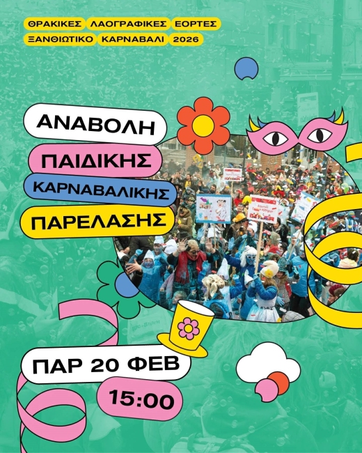 Ο Δήμος Ξάνθης ανακοινώνει ότι, κατόπιν επαφών με την Ένωση Γονέων και Κηδεμόνων και εξαιτίας των δυσμενών καιρικών συνθηκών, η Παιδική Καρναβαλική Παρέλαση αναβάλλεται. Με κύριο μέλημα την ασφάλεια και την προστασία των μικρών μας καρναβαλιστών, η μεγάλη γιορτή των μικρων μεταφέρεται για την Παρασκευή 20 Φεβρουαρίου με ώρα έναρξης στις 15:00. Σας περιμένουμε όλους την Παρασκευή για να γεμίσουμε τους δρόμους της Ξάνθης με χρώμα, κέφι και παιδικά χαμόγελα, υπό τις κατάλληλες πλέον συνθήκες.