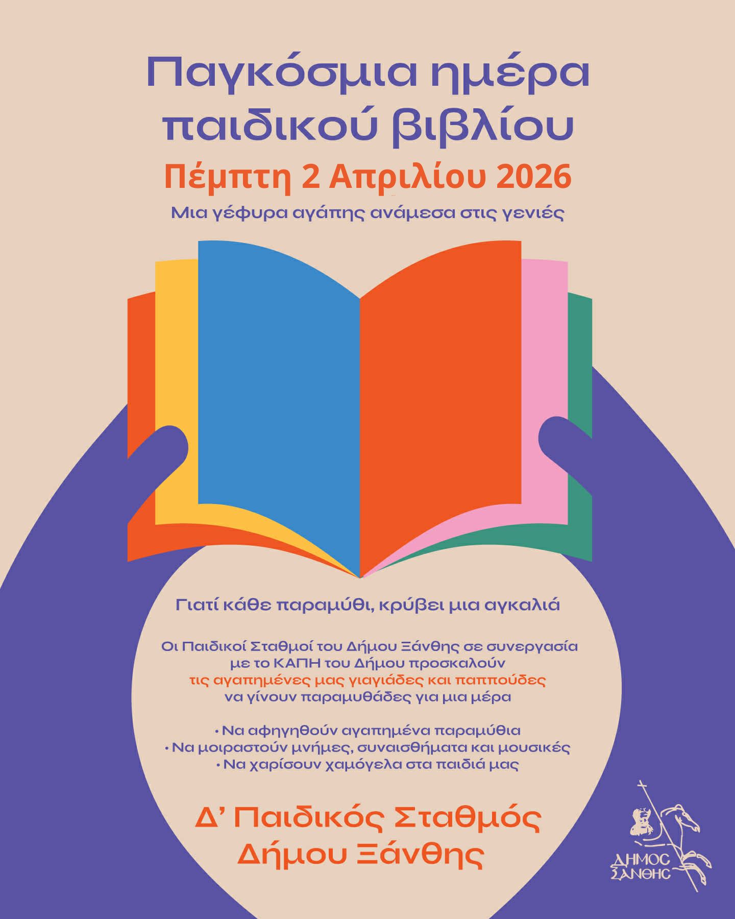 Η μαγεία των παραμυθιών συναντά τη ζεστή αγκαλιά σε μια ξεχωριστή δράση του Δήμου Ξάνθης που φέρνει κοντά δύο διαφορετικούς κόσμους. Με αφορμή την Παγκόσμια Ημέρα Παιδικού Βιβλίου στις 2 Απριλίου, οι Παιδικοί Σταθμοί και το ΚΑΠΗ της πόλης μας ενώνουν τις δυνάμεις τους για να δημιουργήσουν μια ζωντανή γέφυρα ανάμεσα στις γενιές, δείχνοντας ότι οι πιο όμορφες ιστορίες είναι αυτές που μοιραζόμαστε.