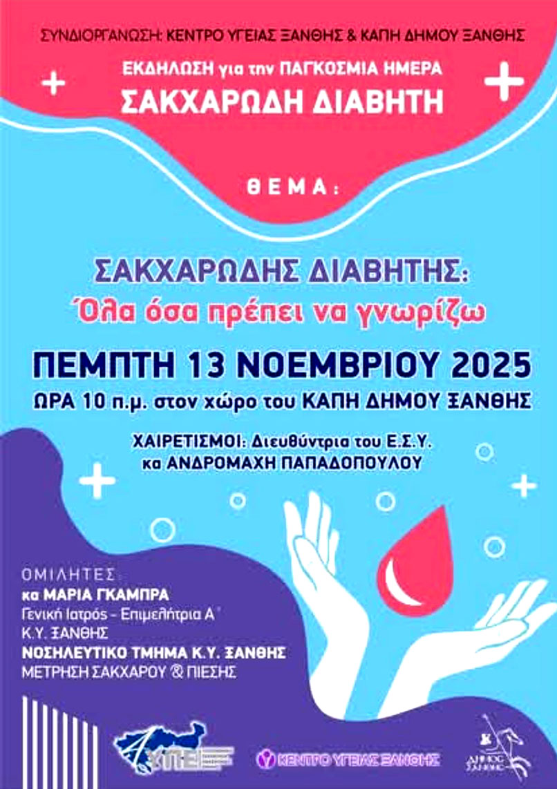 Με αφορμή την Παγκόσμια Ημέρα Σακχαρώδη Διαβήτη, η Διεύθυνση Κοινωνικής Προστασίας, Παιδείας, Αθλητισμού, Τουρισμού Δήμου Ξάνθης σε συνεργασία με το Κέντρο Υγείας Ξάνθης, διοργανώνουν την Πέμπτη 13 Νοεμβρίου 2025 και ώρα 10.00 στην αίθουσα του Κεντρικού ΚΑΠΗ (Καπνεργατών 1), εκδήλωση ενημέρωσης και ευαισθητοποίησης με θέμα: «Όλα όσα πρέπει να γνωρίζω για τον Διαβήτη».