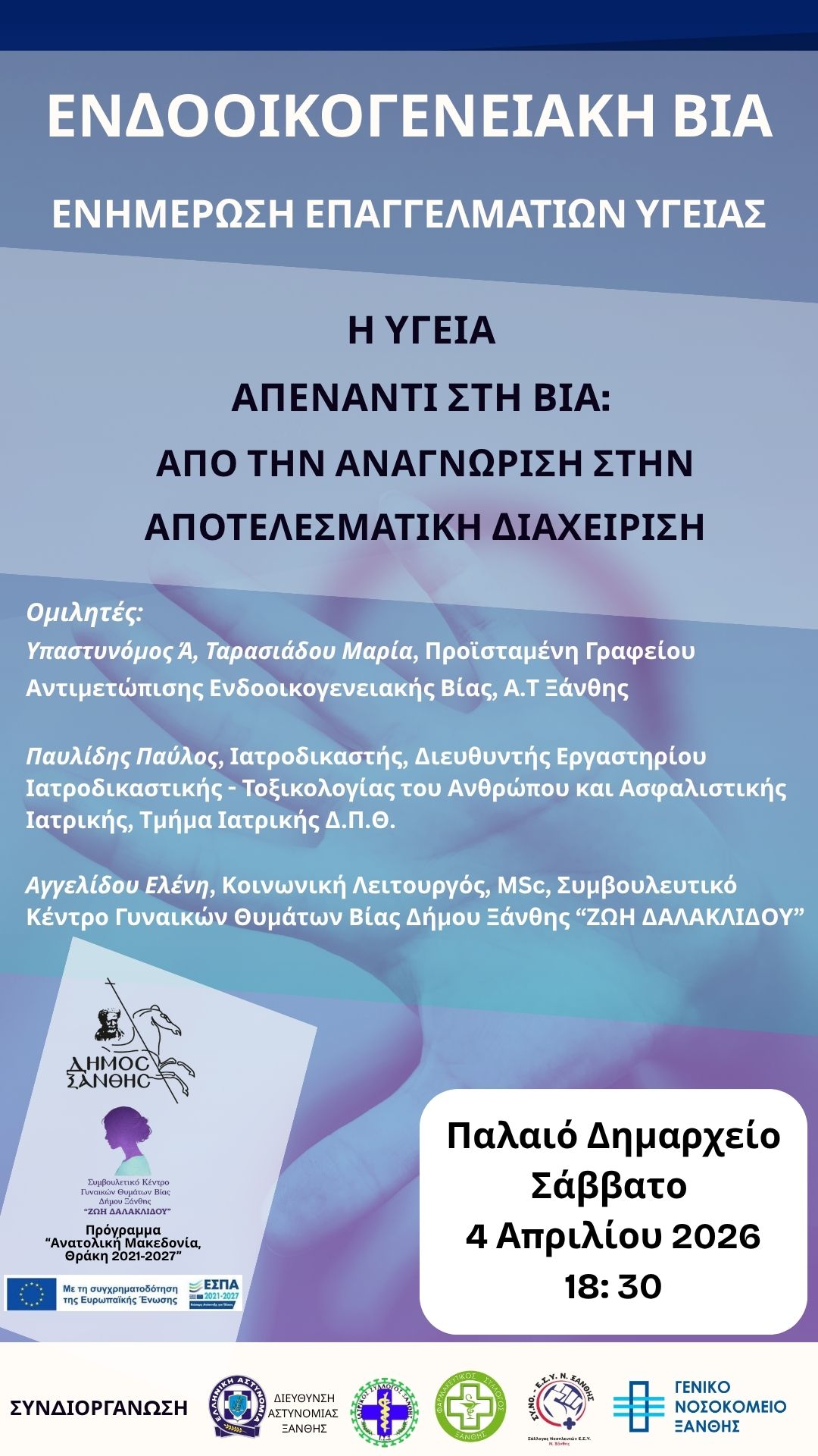 Στο πλαίσιο ενημέρωσης και ευαισθητοποίησης επαγγελματιών υγείας και φορέων, ο Δήμος Ξάνθης και το Συμβουλευτικό Κέντρο Δήμου Ξάνθης «Ζωή Δαλακλίδου» διοργανώνει εκδήλωση με θέμα τη διαχείριση της βίας και τον κρίσιμο ρόλο του τομέα υγείας στην έγκαιρη αναγνώρισή της στην αίθουσα του Παλιού Δημαρχείου, το Σάββατο 4 Απριλίου 2026 και ώρα 18.30.