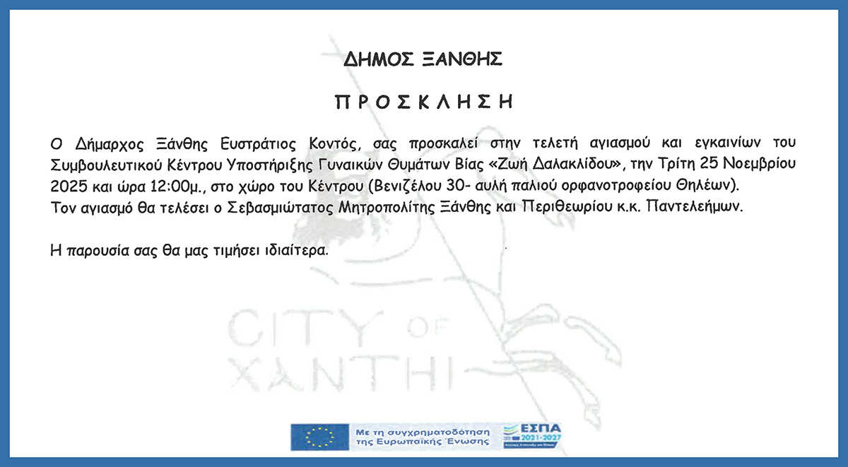 Στο πλαίσιο εκδηλώσεων για τον εορτασμό της Παγκόσμιας Ημέρας Εξάλειψης Βίας, ο Δήμος Ξάνθης εγκαινιάζει την Τρίτη 25 Νοεμβρίου 2025 στις 12μ., τη λειτουργία του Συμβουλευτικού Κέντρου Υποστήριξης Γυναικών θυμάτων Βίας «Ζωή Δαλακλίδου». Η τελετή θα λάβει χώρα στο χώρο του Κέντρου (αυλή πρώην Ορφανοτροφείου Θηλέων – Βενιζέλου 30).
