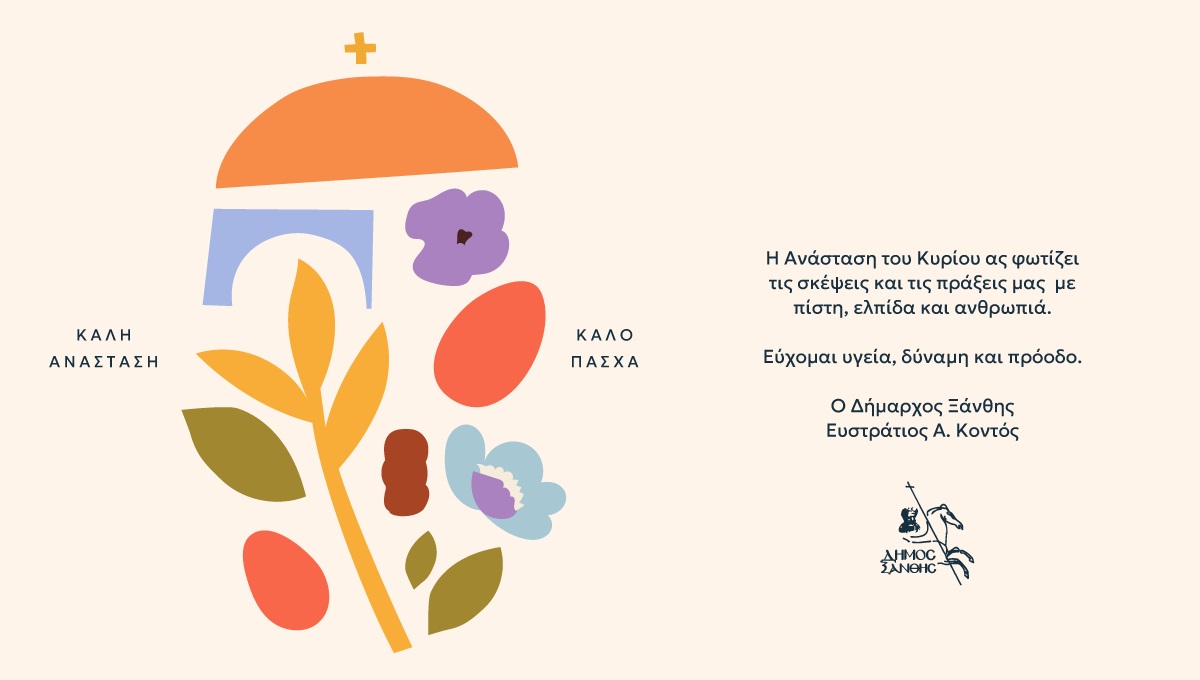 Ο Δήμαρχος Ξάνθης, Στράτος Κοντός, με αφορμή τον εορτασμό του Πάσχα, απευθύνει προς όλες τις Ξανθιώτισσες και όλους τους Ξανθιώτες το παρακάτω μήνυμα: