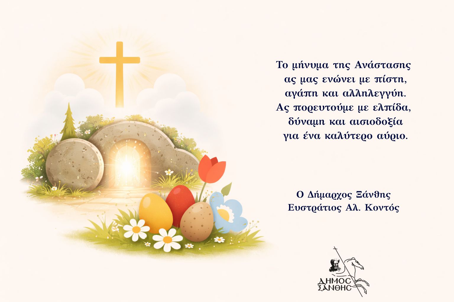 Με αυτό το πνεύμα ενότητας, ας προχωρήσουμε μπροστά με νηφαλιότητα, με την ειλικρινή ευχή το φετινό Πάσχα να χαρίσει σε κάθε σπιτικό της Ξάνθης υγεία, πνευματική γαλήνη και αληθινή χαρά.